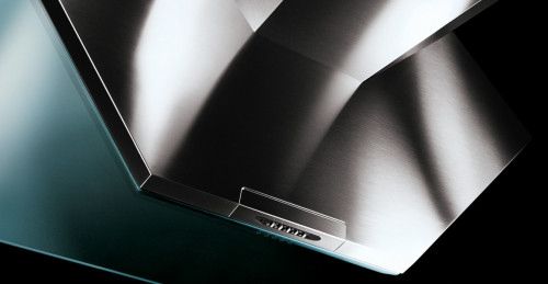 Современная вытяжка, в которой удачно сочетаются сталь и закаленное стекло, идеально вписывается в угловое пространство кухни. Галогенные лампы расположены по периметру вытяжки и полностью освещают варочную поверхность.