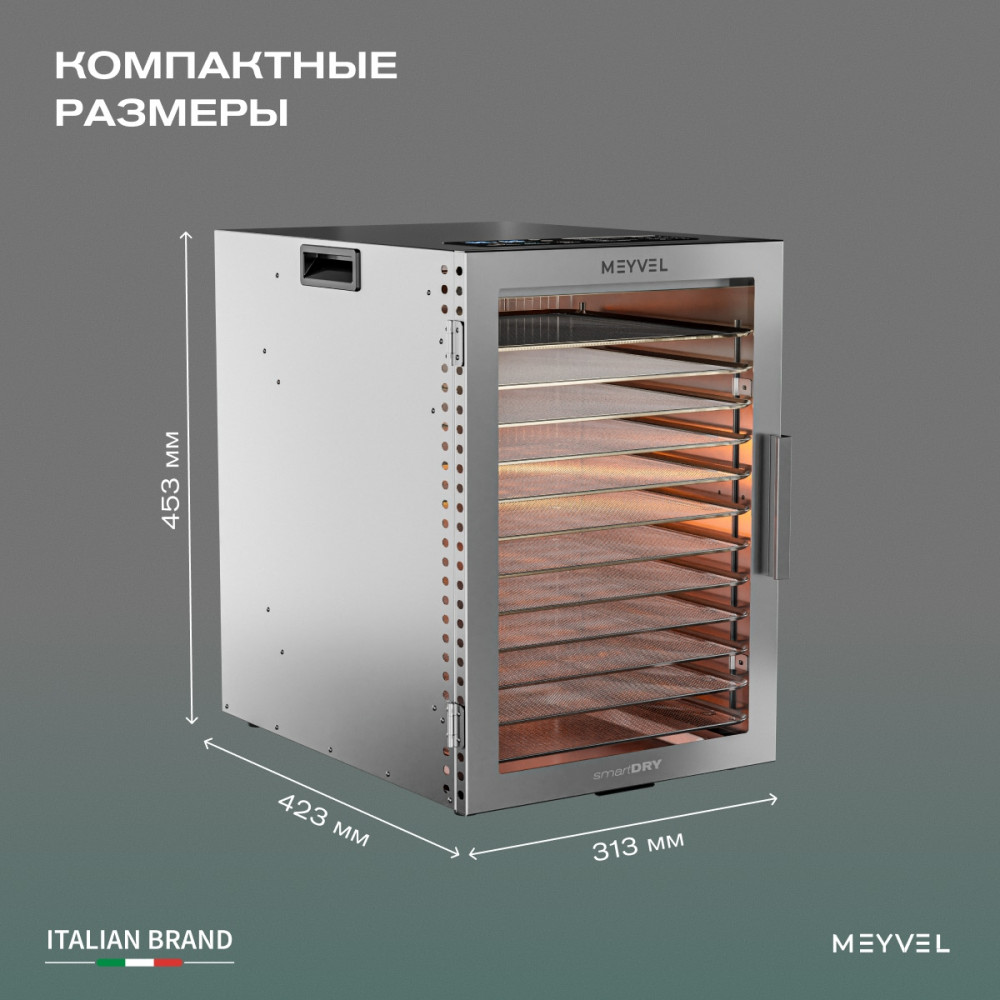 Meyvel MDH12-1S (Нержавеющая Сталь) (Inox) на 10 кг — это мощный дегидратор из нержавеющей стали для бережного высушивания продуктов без потери их вкуса, цвета и пользы. Он функционален, как профессиональная техника, и удобен, как простое домашнее устройство.