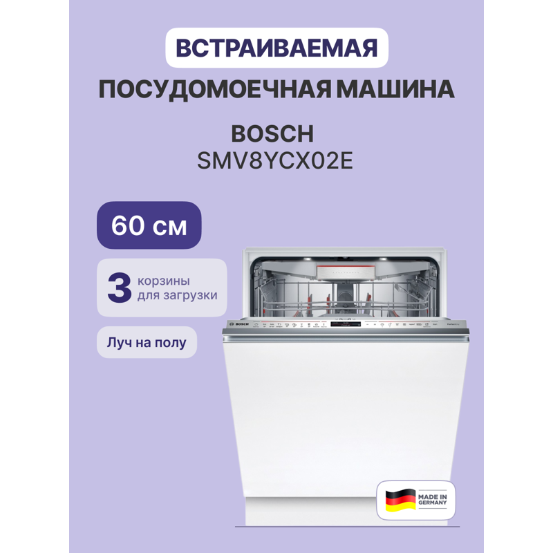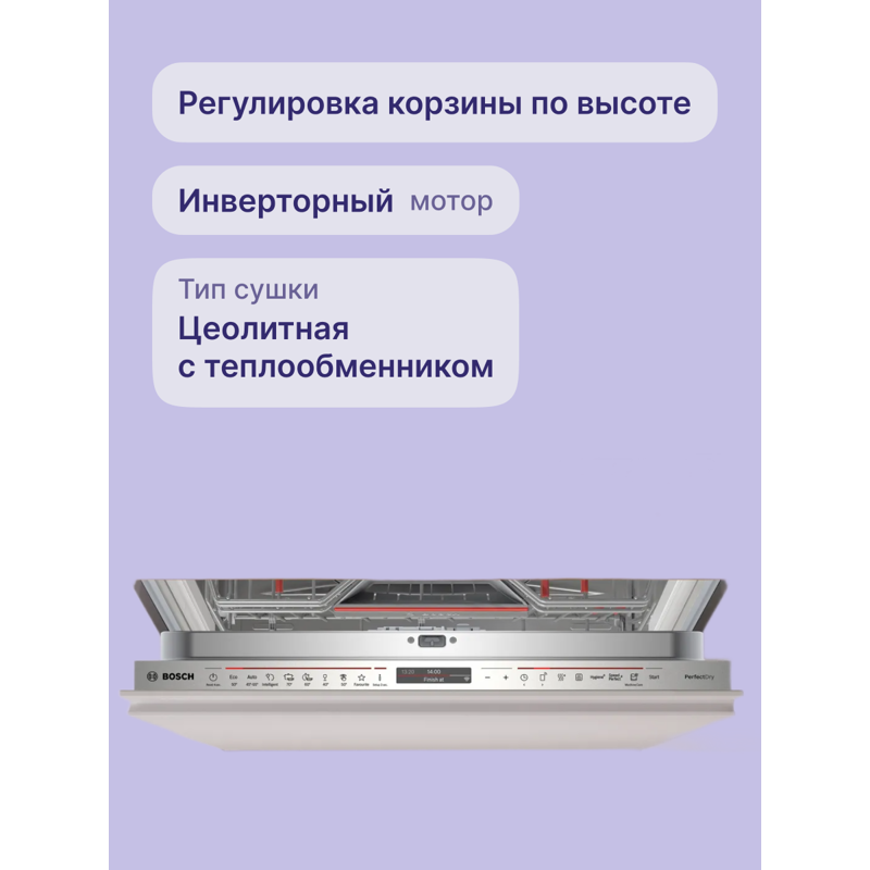 Это премиальная модель шириной 59,8 см, предназначенная для встраивания в кухонный гарнитур. Она рассчитана на 14 комплектов посуды, оснащена сенсорным управлением и 8 программами мойки, включая автоматические и специализированные режимы. Корпус выполнен из нержавеющей стали, а сушка сочетает теплообменник и цеолитную технологию для идеального результата. Дополнительно машина оснащена проекцией дисплея на пол (TimeLight), что позволяет контролировать процесс без открывания дверцы.