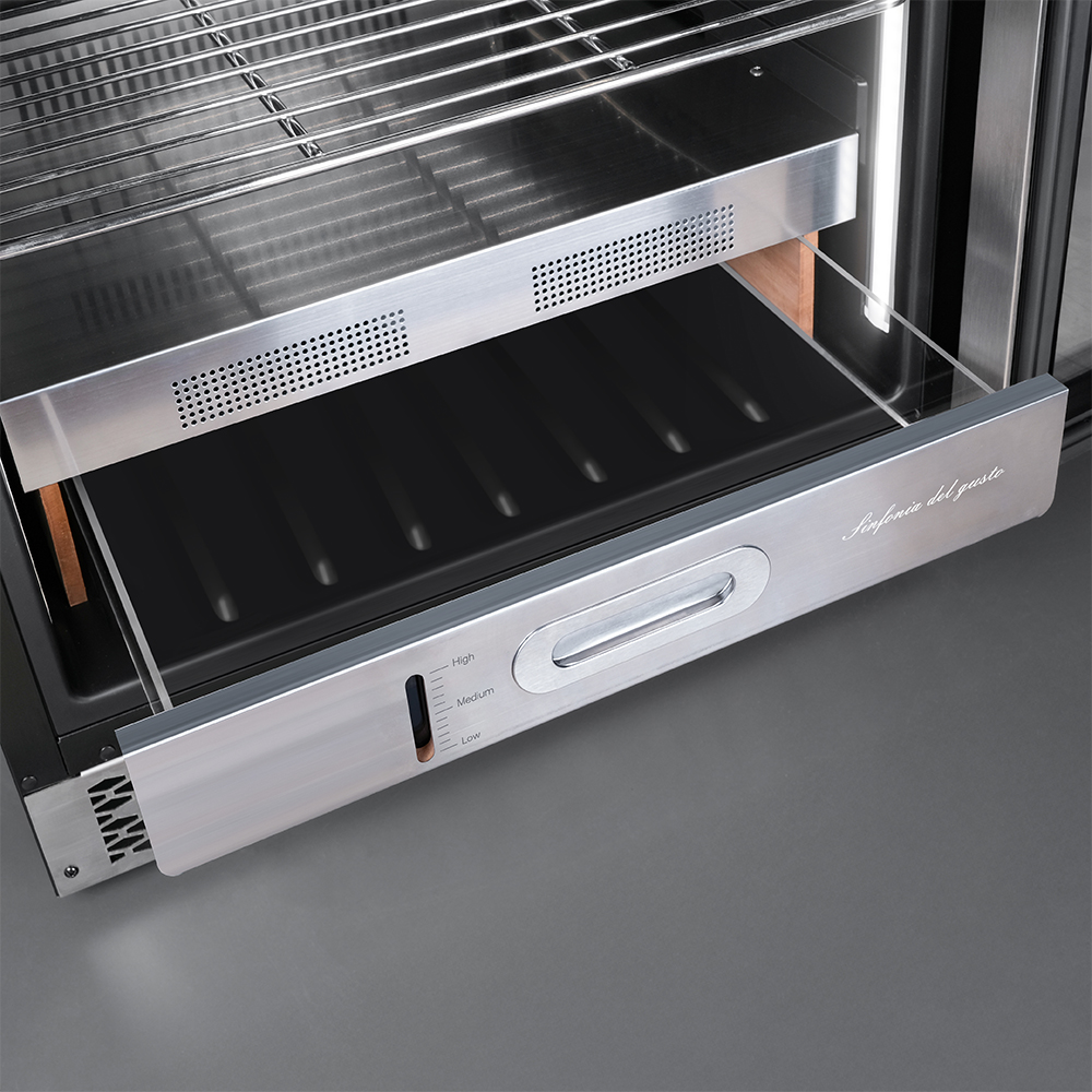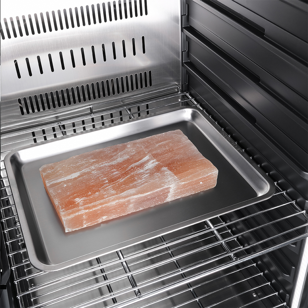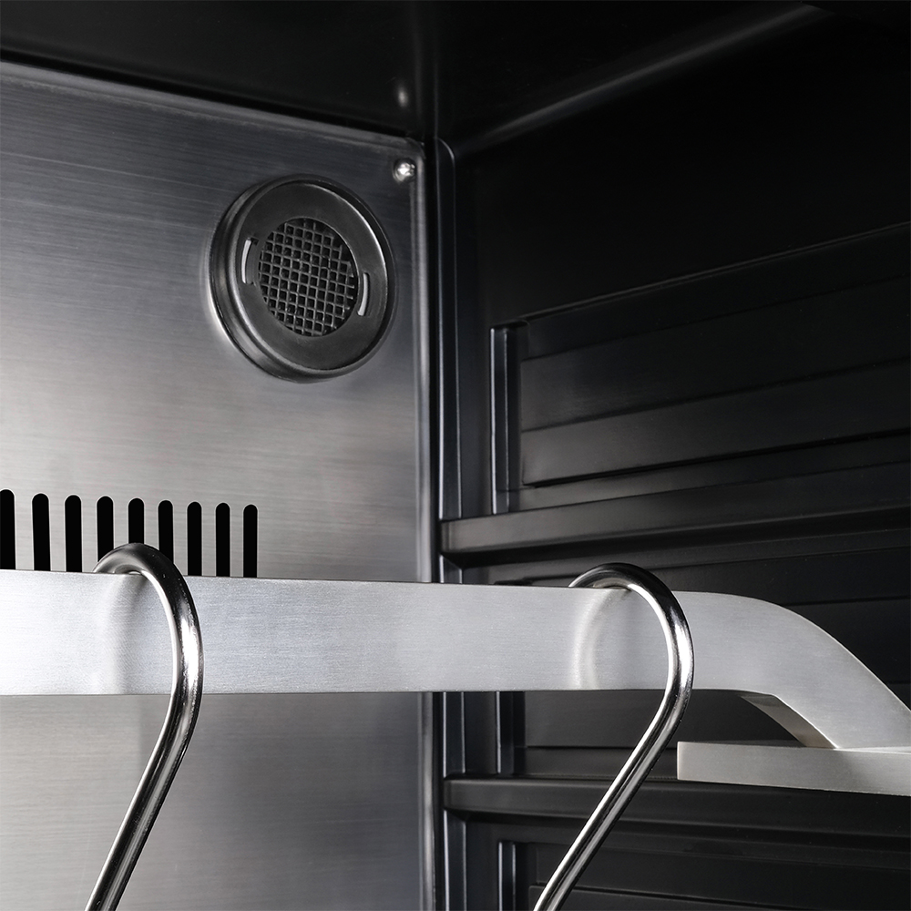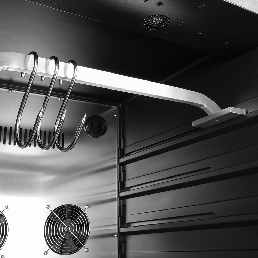 Внутреннее оснащение холодильника продумано до мелочей. Регулируемые ножки позволяют выровнять устройство, а встроенные крюки, поднос для соли и решетки из нержавеющей стали облегчают размещение и сушку содержимого. Резервуар для воды дает возможность контролировать уровень влажности в диапазоне от 60 до 85%, что важно для равномерного вызревания.